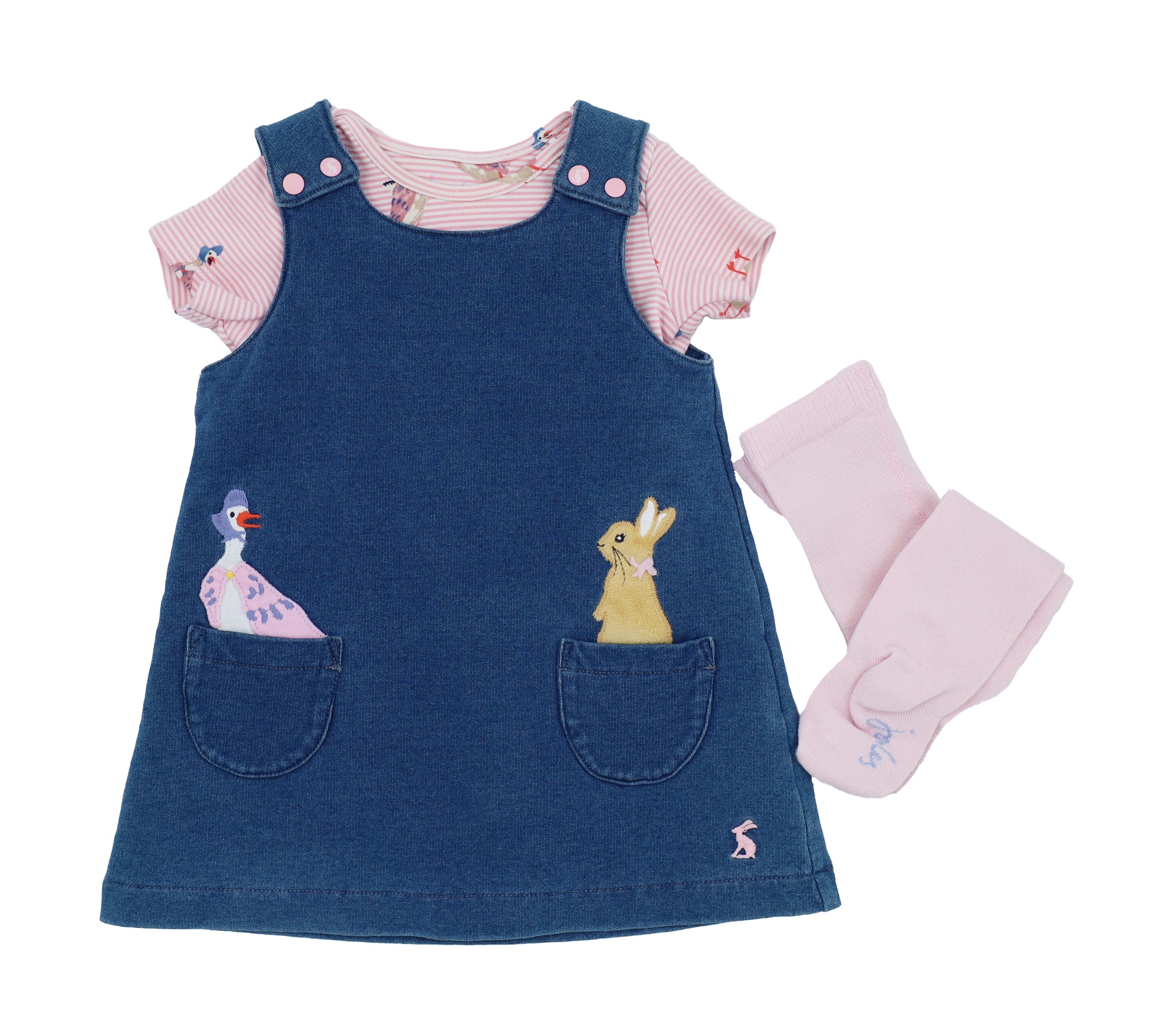 Denim jersey dress with two snap close on shoulders with matching stripe onesie and pink logo tights